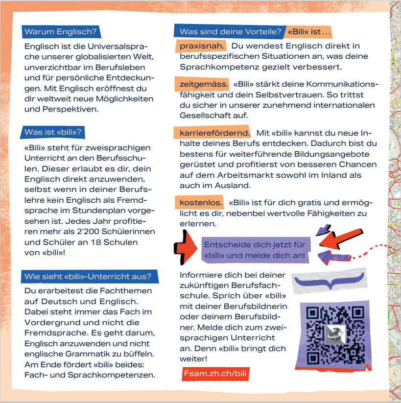 Bilingualer Unterricht wird an den Berufsfachschulen im Kanton Zürich seit 1999 angeboten. Kantonsweit werden mehr als 3100 Lernende an 19 Berufsfachschulen in rund 40 Berufen in verschiedenen Fächern zweisprachig unterrichtet. In verschiedenen Berufen werden zweisprachige Abschlussprüfungen durchgeführt und der Erfolg in den Fähigkeitszeugnissen ausgewiesen.