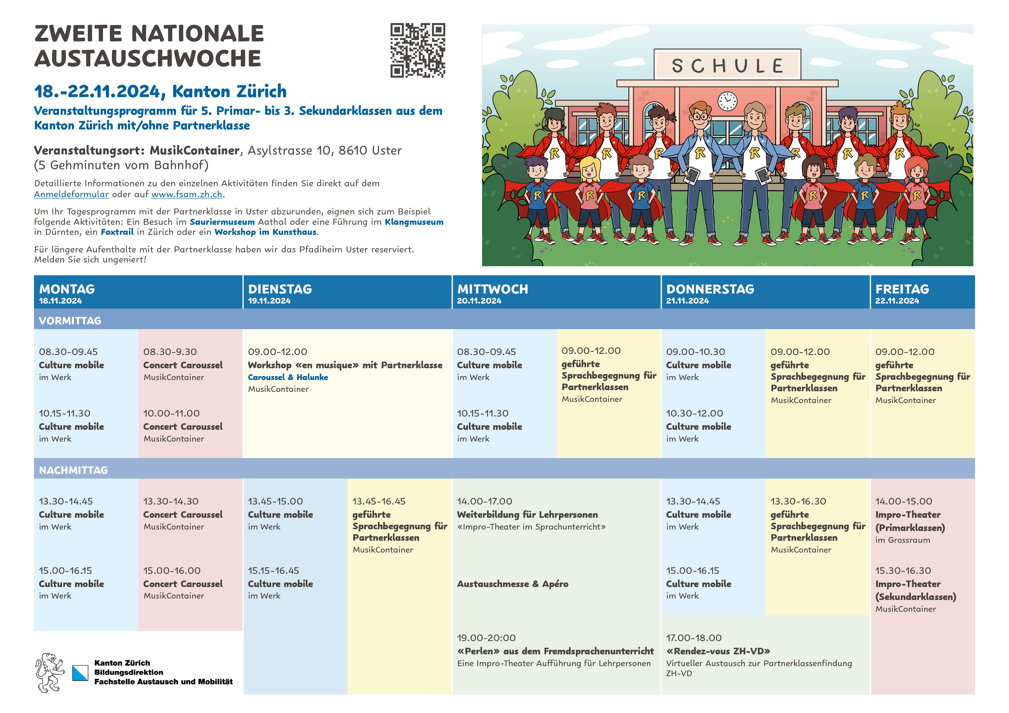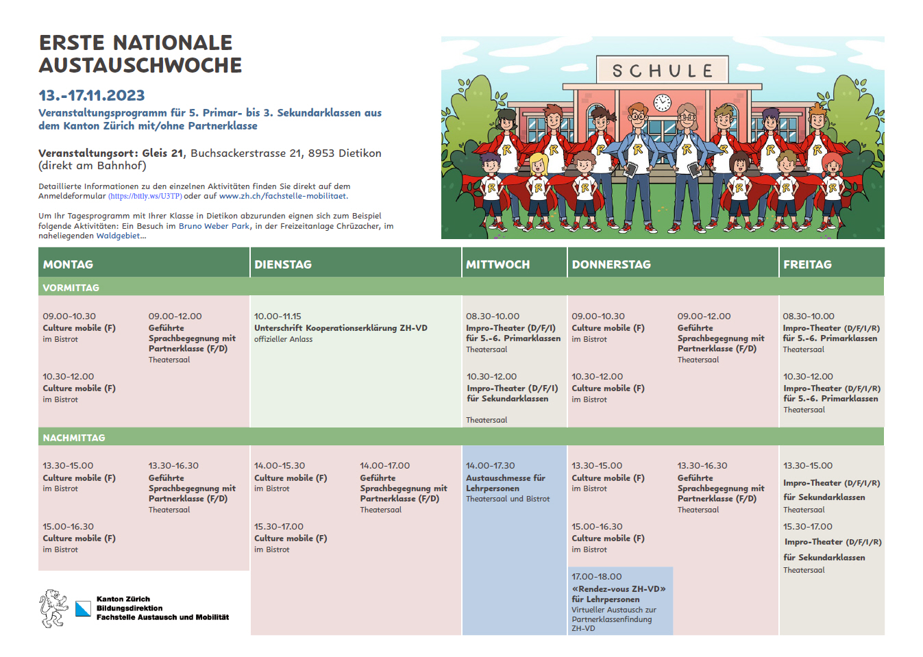Zu diesem Anlass schafft die Fachstelle Austausch und Mobilität des Kantons Zürich einen lebendigen Begegnungsort mit einem vielfältigen Programm für Schulklassen und Lehrpersonen.